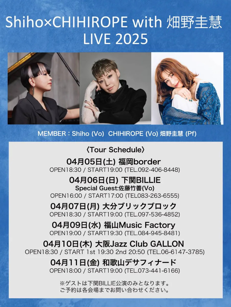 【Shiho×CHIHIROPE with 畑野圭慧 Live2025西日本ツアー】 SCHEDULE 2025/04/05(土) 18:00 - 2025/04/11(金) 00:00 URLをコピーする 報告する